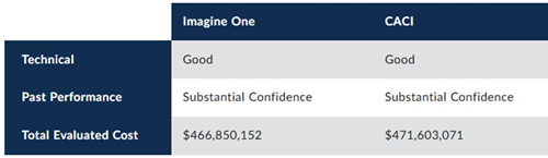 The 5-year award for $416.5M was originally made in August 2024 to CACI. Imagine One and HII-Alion immediately protested. Following corrective action, the Government made a new award to CACI for $416.5M on July 31, 2025. Imagine One immediately filed a new protest.